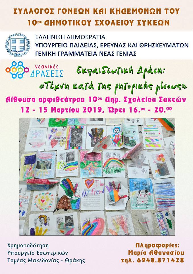 Την Παρασκευή 15 Μαρτίου 2019 τελείωσε με επιτυχία το 4μερο εκπαιδευτικό σεμινάριο με τίτλο “Η τέχνη κατά της ρητορικής μίσους” που απευθυνόταν σε γονείς και εκπαιδευτικούς του Δήμου Νεάπόλης-Συκεών στη Θεσσαλονίκη. 10 γονείς και εκπαιδευτικοί παρακολούθησαν το σεμινάριο το οποίο βασίστηκε στη μη τυπική εκπαίδευση, έμαθαν περισσότερα για τη ρητορική μίσους και πως αντιμετωπίζεται στις υπόλοιπες χώρες της Ευρώπης και δημιούργησαν τις δικές τους δράσεις αντιμετώπισης του φαινομένου αυτού.