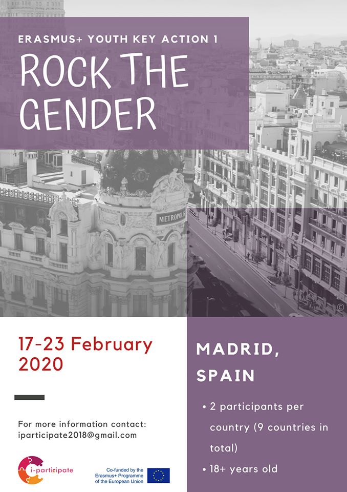 Στα πλαίσια του Erasmus+ παρακολουθήσαμε και συμμετείχαμε στο πρόγραμμα “ROCK THE GENDER” που έλαβε χώρα στη Μαδρίτη από τις 17 έως τις 23 Φεβρουαρίου 2020. Η διεξαγωγή του παραπάνω προγράμματος ήταν μια σημαντική εμπειρία όσο αφορά όλα αυτά που αποκομίσαμε μέσω της μη-τυπικής μάθησης. Οι συμμετέχοντες του προγράμματος κατάγονταν από τη Σλοβακία, τη Βουλγαρία, τη Ρουμανία, την Ιταλία, την Εσθονία, τη Πολωνία, την Ισπανία και την Ελλάδα.