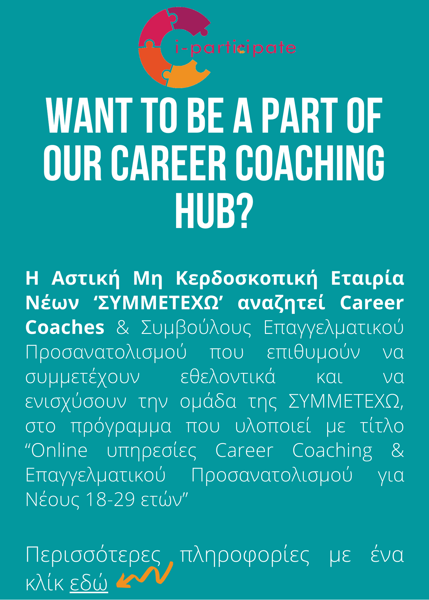 Η Αστική Μη Κερδοσκοπική Εταιρία Νέων ‘ΣΥΜΜΕΤΕΧΩ’, για να ανταποκριθεί στις ανάγκες και τους προβληματισμούς των Νέων σε θέματα καριέρας, έχει έρθει σε συμφωνία με έμπειρους Career Coaches & Συμβούλους Επαγγελματικού Προσανατολισμού και παρέχει δωρεάν online ατομικές υπηρεσίες επαγγελματικού προσανατολισμού σε Νέους 18-29 ετών (περισσότερες πληροφορίες εδώ).