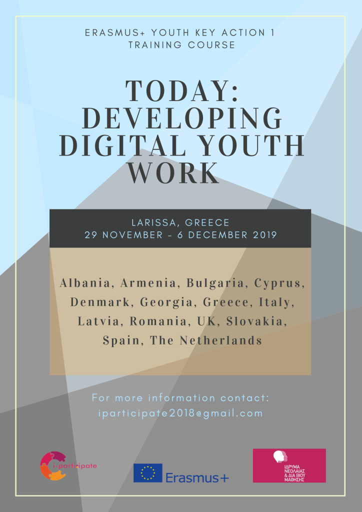Το εκπαιδευτικό πρόγραμμα «ToDAY: Developing digital Youth work» πραγματοποιήθηκε στη Λάρισα από τις 28/9 έως 6/10/2019. Συμμετείχαν σε αυτό 30 νέες και νέοι από χώρες της Ευρώπης οι οποίοι κατά τη διάρκεια της εκπαίδευσης: