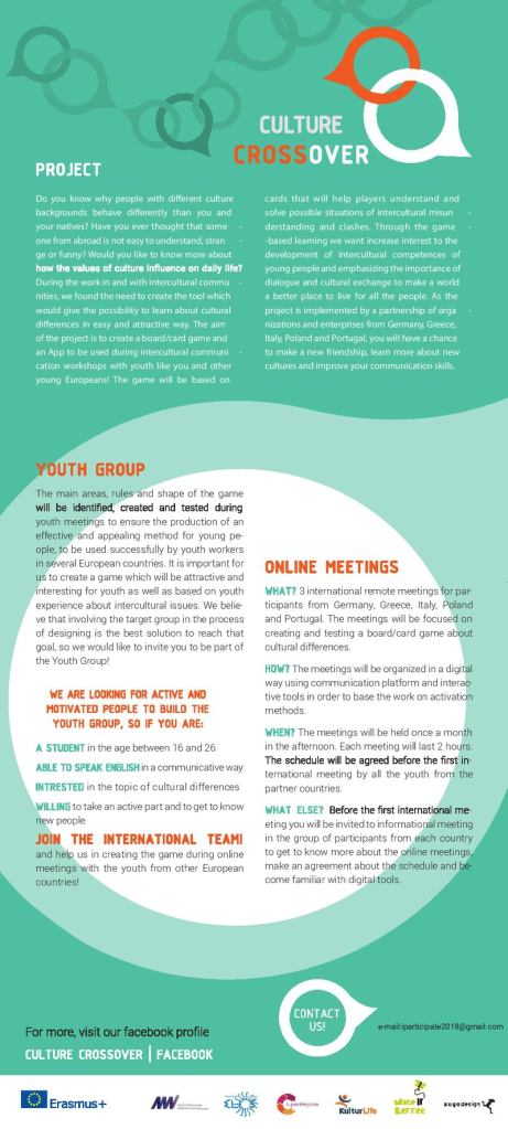 Η 1η φάση του project “Culture Crossover” στο οποίο είναι εταίρος η Συμμετέχω μόλις ξεκίνησε! Σκοπός μας είναι μέσα από αυτό το έργο να συμβάλλουμε στην ανάπτυξη των διαπολιτισμικών ικανοτήτων των νέων δημιουργώντας ένα επιτραπέζιο παιχνίδι. Αν θέλεις να γίνεις μέλος της ομάδας του “Youth Testing Group” και να πάρεις μέρος στη δημιουργία του και εαν είσαι από Ελλάδα, Αλβανία ή Συρία συμπλήρωσε αυτή τη φόρμα εγγραφής και θα επικοινωνήσουμε εμείς μαζί σου.
